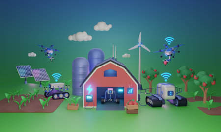 Smart agriculture and precision farming with robots 3D illustration concept. Effective autonomous plant growth control, analysis management and harvest with drones. Innovative AI for crops monitoring