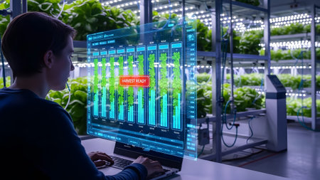 Person checks harvest ready status on holographic display in vertical farm with lettuce Clear det...