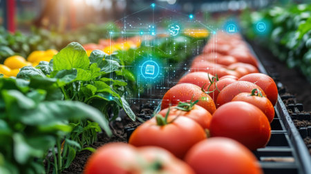 This vibrant image captures fresh red tomatoes growing in a greenhouse, showcasing the intersection of agriculture and technology for sustainable practices and modern farming.