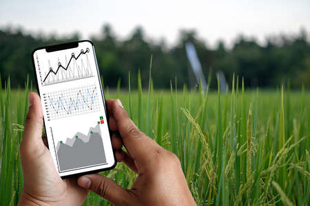Hand holding smartphone,Organic farm background,agricultural product control technology and agriculture futures trading world market