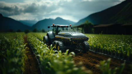 Agriculture robotic and autonomous car robot working in smart farm. Generative AI.