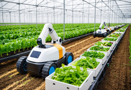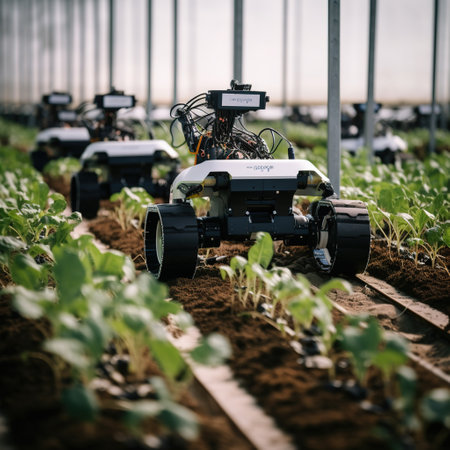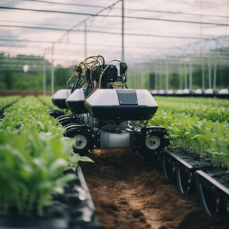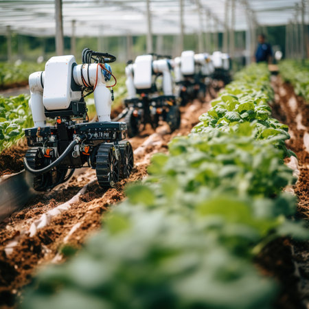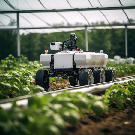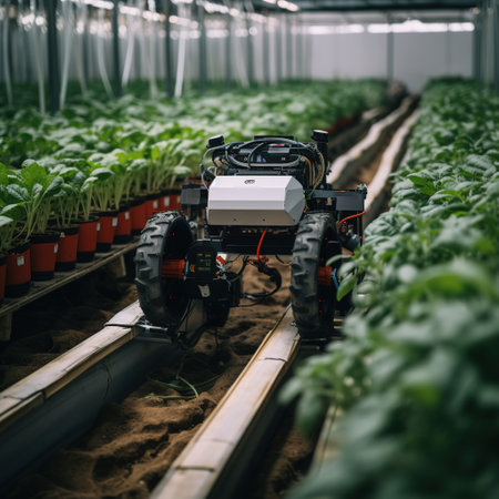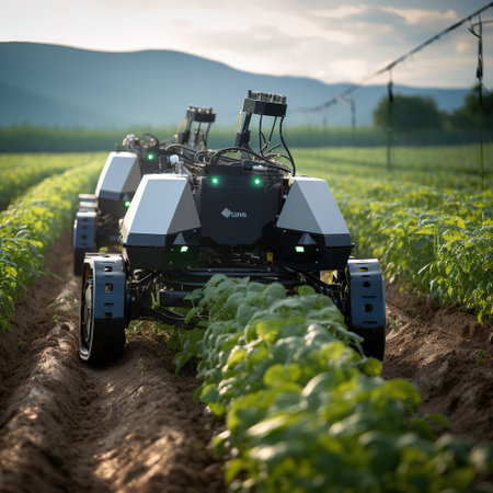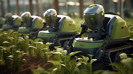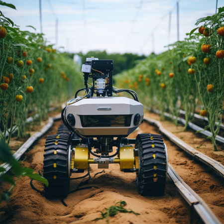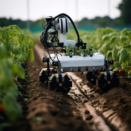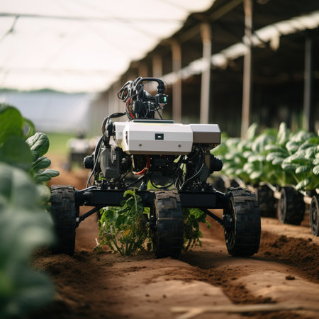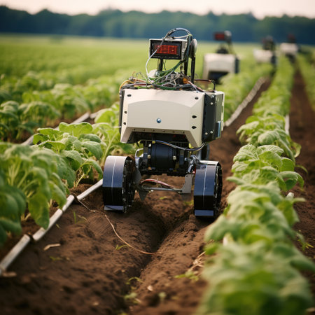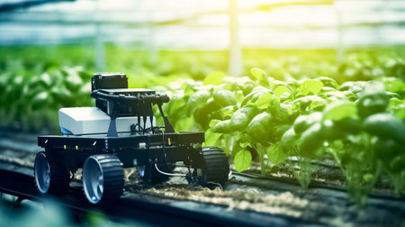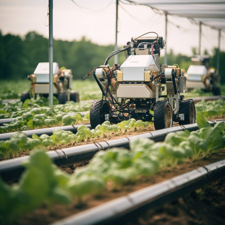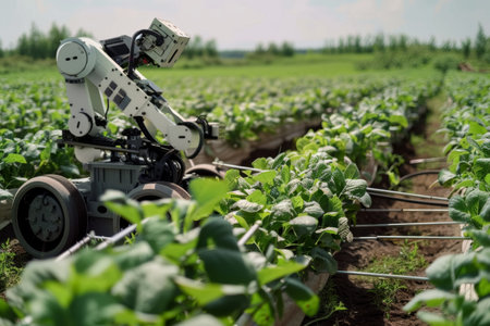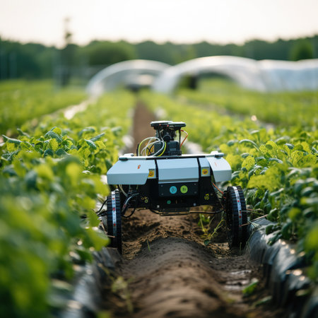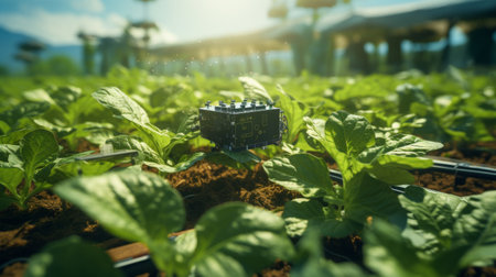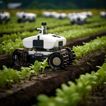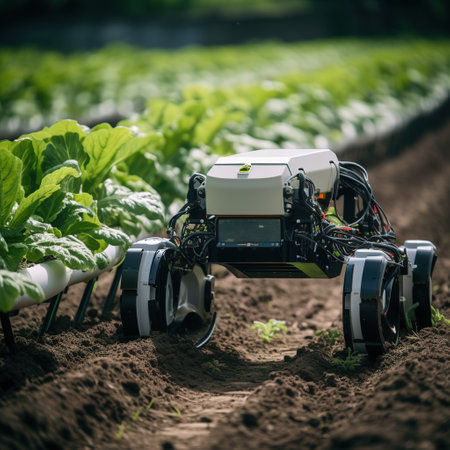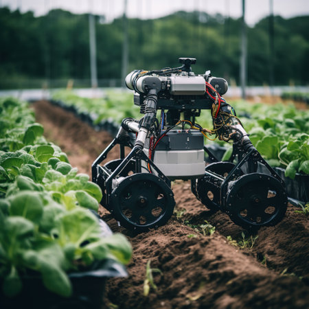 In the realm of digital agriculture, a smart machine tends to a field of vegetables.