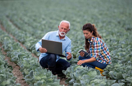 Mature farmer and young woman with laptop squatting in vegetable garden and checking quality
