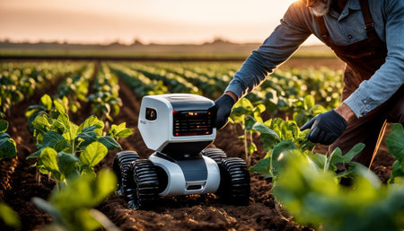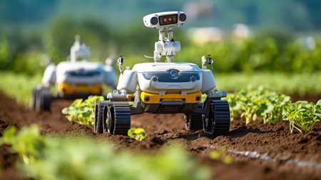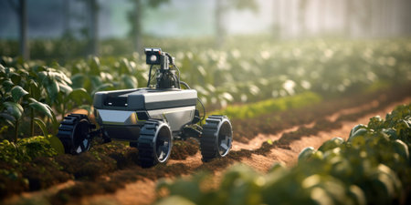 An autonomous robot traverses farmland, equipped for agricultural tasks, representing the future of farming technology