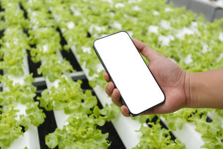 Mockup mobile phone blank white screen, hands holding smartphone empty display use for application information and advertise with organic vegetable farm background.