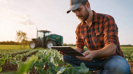 A farmer uses a tablet for data analysis in a green field, showcasing the intersection of modern technology and traditional agriculture practices.