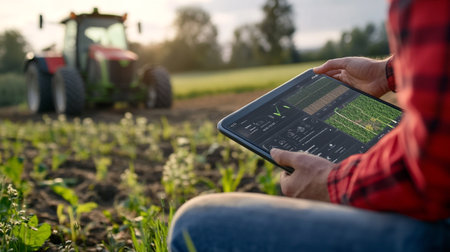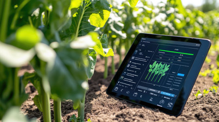 A digital farm dashboard on a tablet, showing real-time data on crop health, irrigation, and weather predictions.