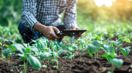 A farmer analyzes seedling data on a tablet, surrounded by modern agricultural technology and digital icons for precision farming.