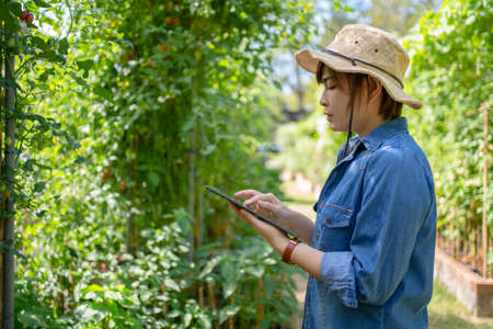 Farmers use agricultural technology in data analysis tablets and image icons. New technologies in agricultural business concepts. Women use tablets to research and develop plant varieties. Smart farm.