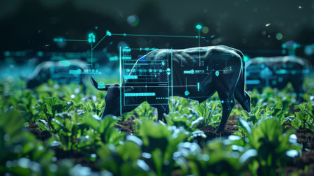 Smart farm technology meets agricultural expertise. Precision livestock management and agriculture drones enhance productivity. Modern farming practices. Innovation in sustainable agriculture.
