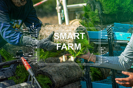 modern farmer using Smart Farming, Farming technology innovation software for new agriculture plant monitor control.