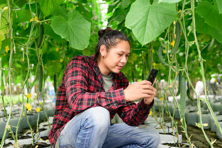 Young man Asian farmer using smartphone in organic cucumber greenhouse farm