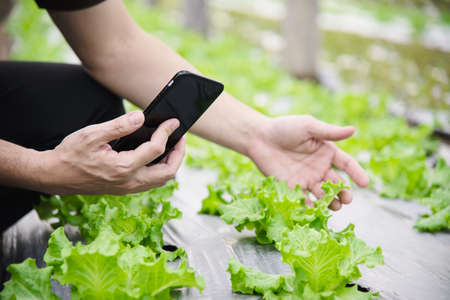 Farm man working in his organic lettuce garden - smart farm people in clean organic agricultural concept