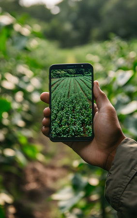 Smart farming technology concept. A smartphone capturing a lush green agricultural field with a digital farming app