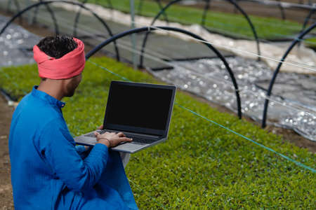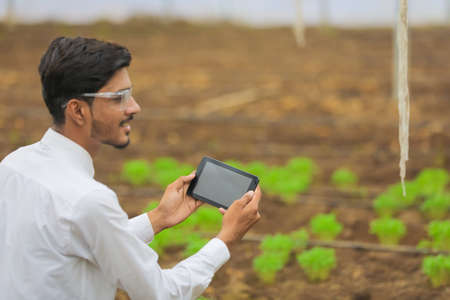 Technology and people concept, Young indian agronomist using tablet or smartphone at greenhouse