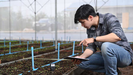 Smart farmer man using digital tablet tablet examining the growth of plants in the greenhouse.