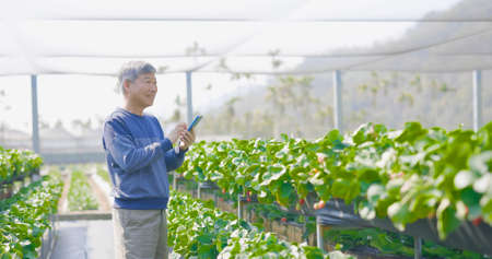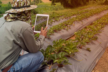 The Asian elder farmers men who use a tablet taking pictures of stawberry plants For further analysis in the laboratory.