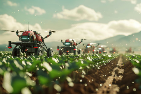 Robotic machinery and drones revolutionizing crop management in a green field, with a focus on futuristic farming techniques.