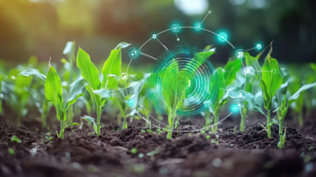 A striking image illustrating a smart farming concept with young corn plants. The blend of technology and agriculture promotes sustainable growth and innovation in farming practices.