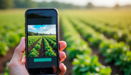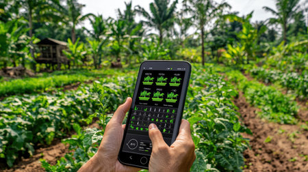 young farmer using a smartphone app to monitor crop health and irrigation, representing the integration of technology in modern farming.