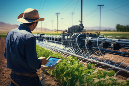 Smart farmer using digital tablet in hydroponic greenhouse with robot arm