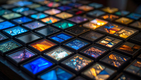 Antique microscope slides arranged like a mosaic, backlit with stained glass colours