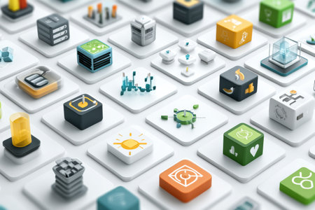 Isometric icons and digital symbols are neatly arranged on a grid background representing different technologies and concepts.