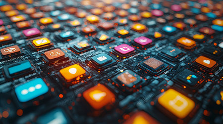 A three-dimensional composition showcasing a futuristic array of illuminated app icons symbolizing digital technology, social media, and global connectivity, all rendered in vivid and colorful hues.