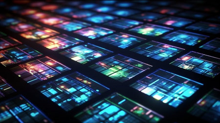 A vibrant futuristic wall of digital screens showcasing colorful landscapes and abstract visuals