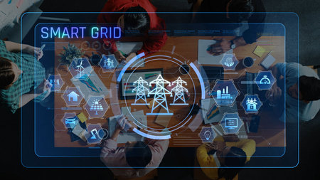 A modern workspace showcases a diverse team engaged in a strategic meeting. They discuss smart grid technology with digital interfaces, enhancing collaboration and innovation. Raster