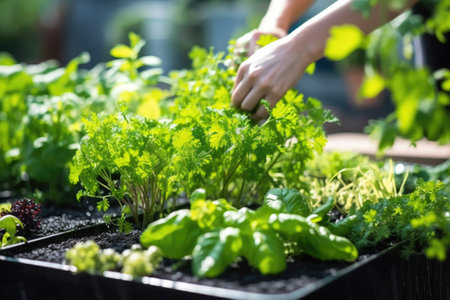 Gardener cutting spicy herbs with scissors growing at home vegetable garden, close-up view. Concept of home growing organic greens