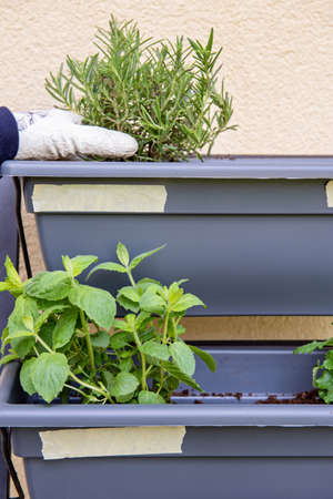 closeup of caucasian man, in a gray working coat, planting some different aromatic herbs, such as mint, basil or parsley, in a green plastic window flower box