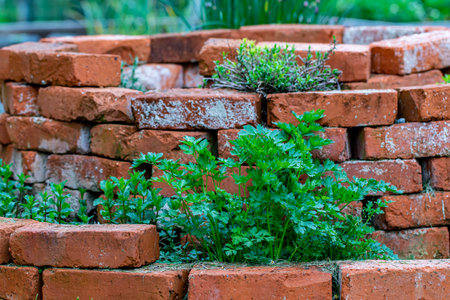 Bright green curly leaved parsley with brick wall behind. Space for copy.