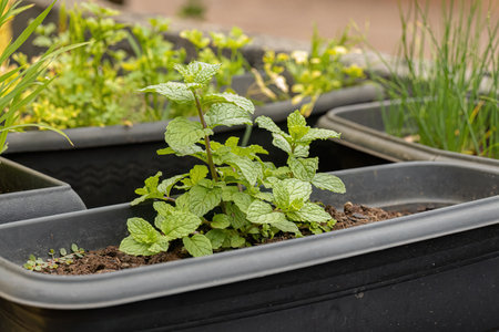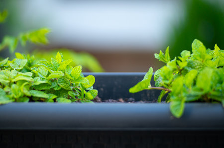 Close-up of growing mint plant in a pot in the backyard garden.