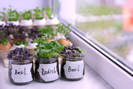 micro-greenery on the windowsill. Healthy eating. green fresh radish grass and basil.