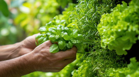 Fresh garden herbs. Gardener holding fresh herbs, closeup. With copy space.