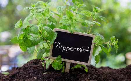 Peppermint mint plant close up view. Fresh potted in soil aromatic herb and wooden label with text, blur nature background