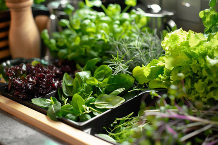 Close-up of fresh microgreens growing on shelves in greenhouse