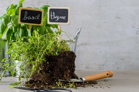 Home gardening. Thyme and basil bush in pots, and gardening tools on concrete stand.
