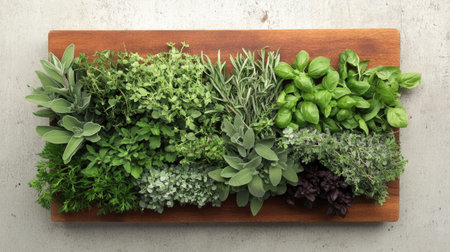 Row of fresh aromatic spicy herbs in small piles on old wooden plank. Assortment of organic herbs for spicy cuisine. Copy space