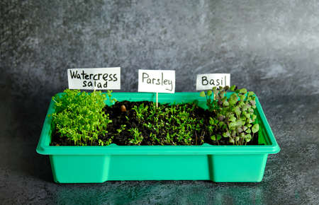 Basil microgreens, parsley, watercress. Mini greenhouse at home. Growing greens in a mini greenhouse. Sprouts