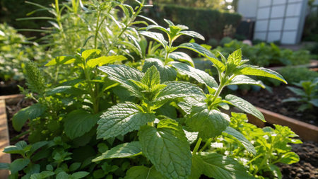 Mint with small fresh leaves, growing upright in fertile soil, sunlight filtering gently, realistic textures, vibrant green tones, natural photography style, wide balanced composition for timelapse video.
