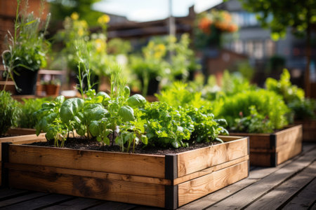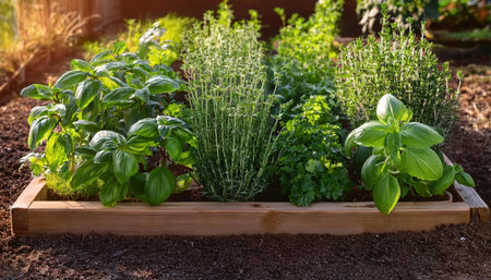a box with herbs in the backyard garden