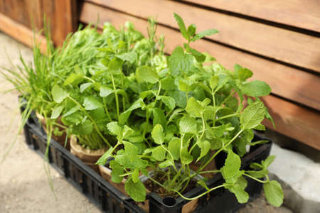 Growing spicy herbs at home vegetable garden, wooden plate with inscription, close-up. Growing mint in wooden planters outdoors