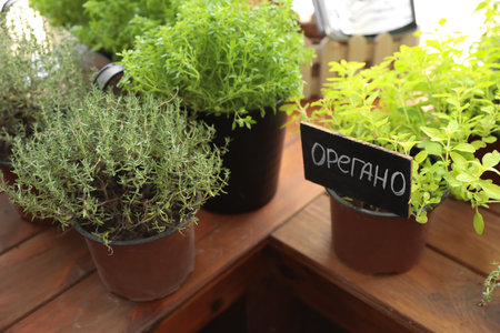 Homegrown and aromatic herbs in old clay pots. Set of culinary herbs. Green growing basil, oregano, dill, parsley and chives with labels