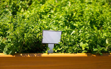 Growing spicy herbs at home vegetable garden, putting wooden plate with a name of plants. Growing mint in wooden planters outdoors