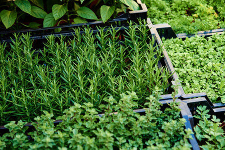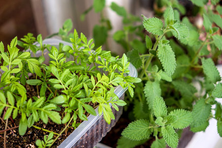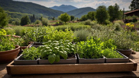 Cultivating basil in a greenhouse in summer season. Growing own herbs and vegetables in a homestead. Gardening and lifestyle of self-sufficiency.