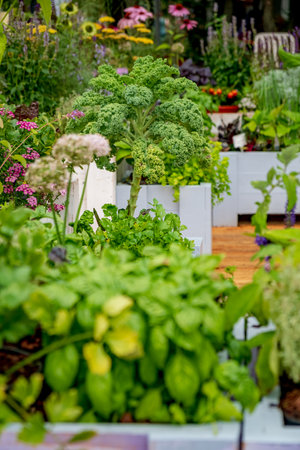 Early summer in urban vegetable garden.