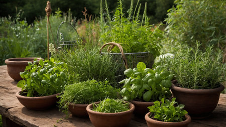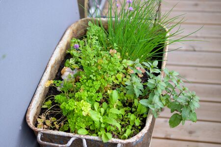 Fresh herbage in pots grown in the garden
