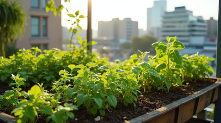 green salad onions and parsley in flower box on balcony
